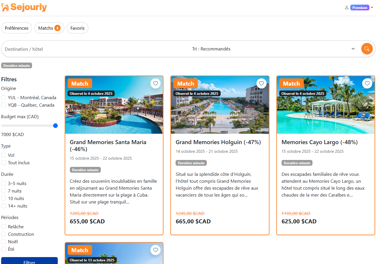 Débloquez la totalité du catalogue Sejourly, recevez les alertes instantanées et filtrez les offres selon vos envies.